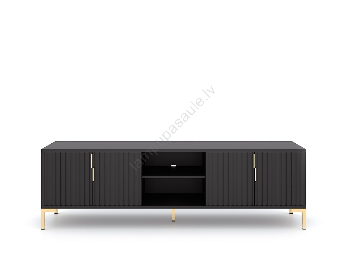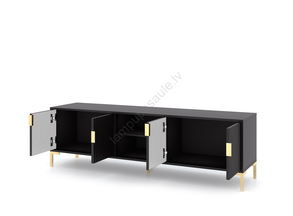 • Tam ir divas aizvērtas sānu nodalnes, katra ar divām durtiņām ar simetriskiem rokturiem un ribojumu, kā arī divi atvērti plaukti ar kabeļa atveri centrā.