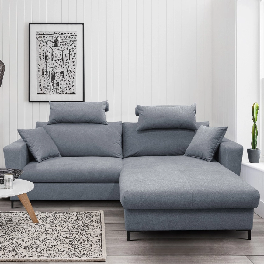 • Izvelkams L-formas stūra dīvāns HORTA ar ietilpīgu uzglabāšanas nodalījumu — labais, pelēks