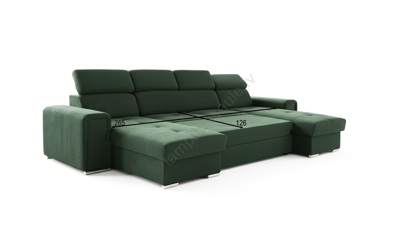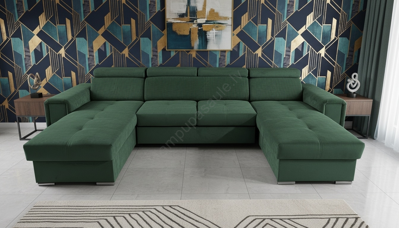 • Izvelkamais dīvāns ar universālu U veida stūri un glabāšanas nodalījumu SALVADA zaļā krāsā