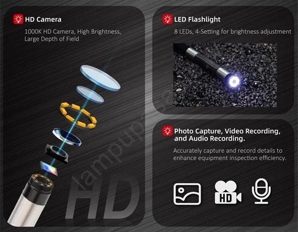• Zondes galā ir 8 mm diametra objektīvs ar astoņām LED diodēm un četru līmeņu regulējamu spilgtumu, kas nodrošina ideālu apgaismojumu pārbaudāmajai vietai.