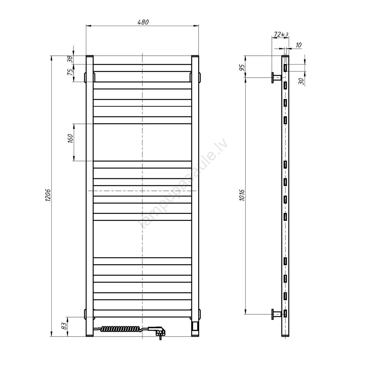 • Vannas istabas dvieļu žāvētājs ar termostatu AVANGARD 227W 120x48cm, melns, labais