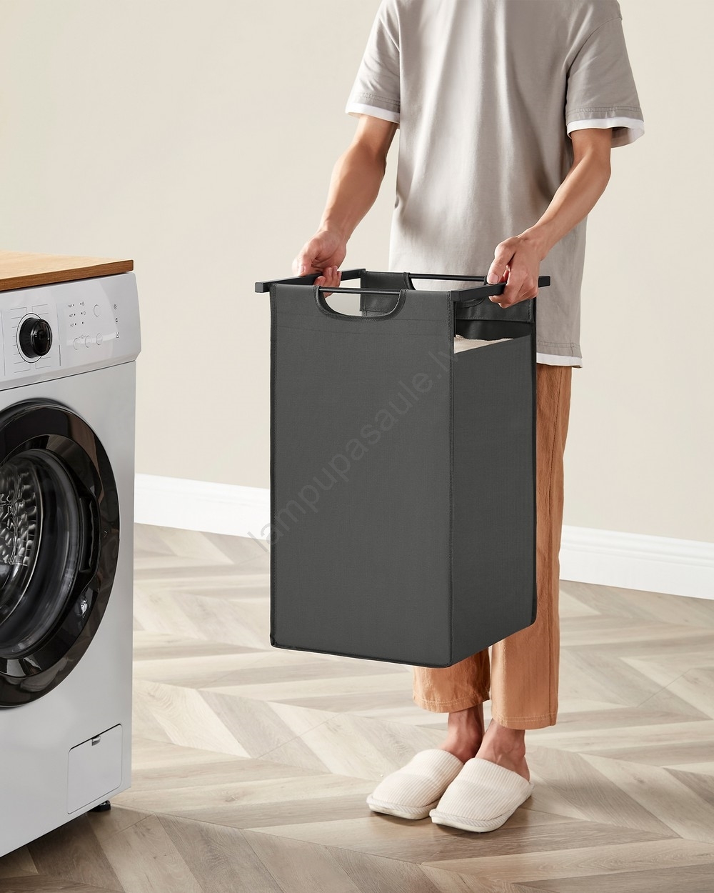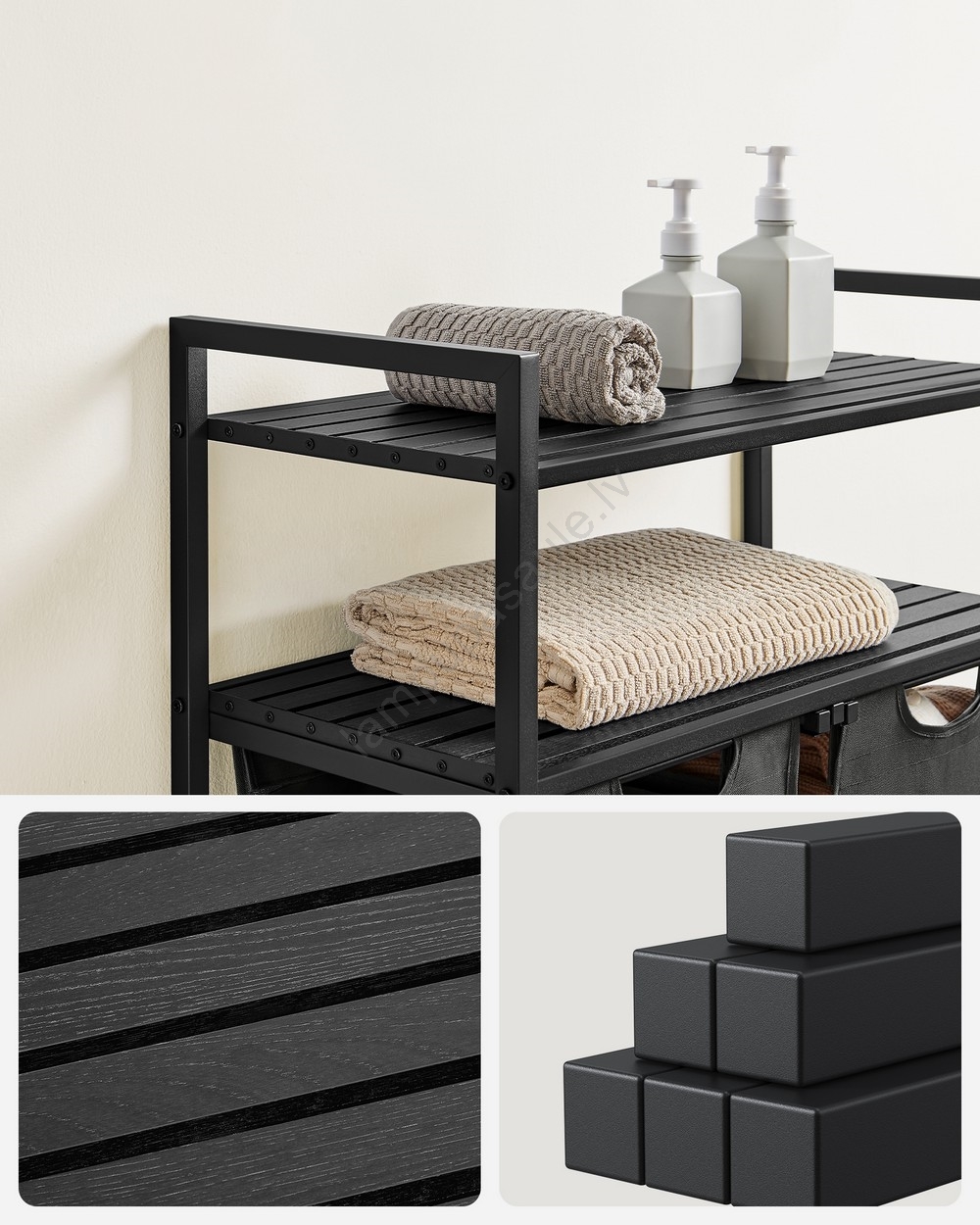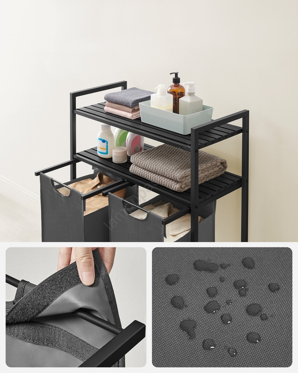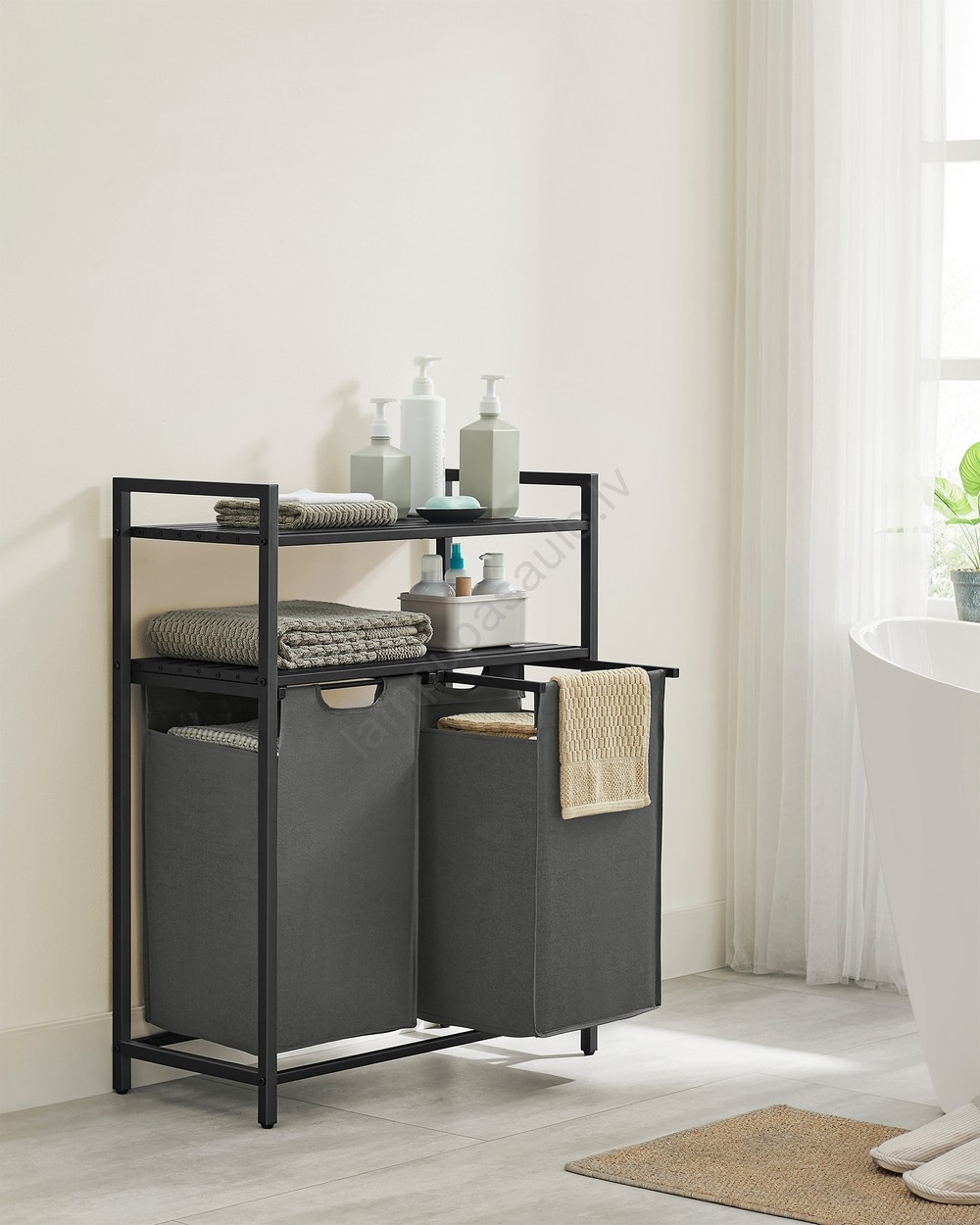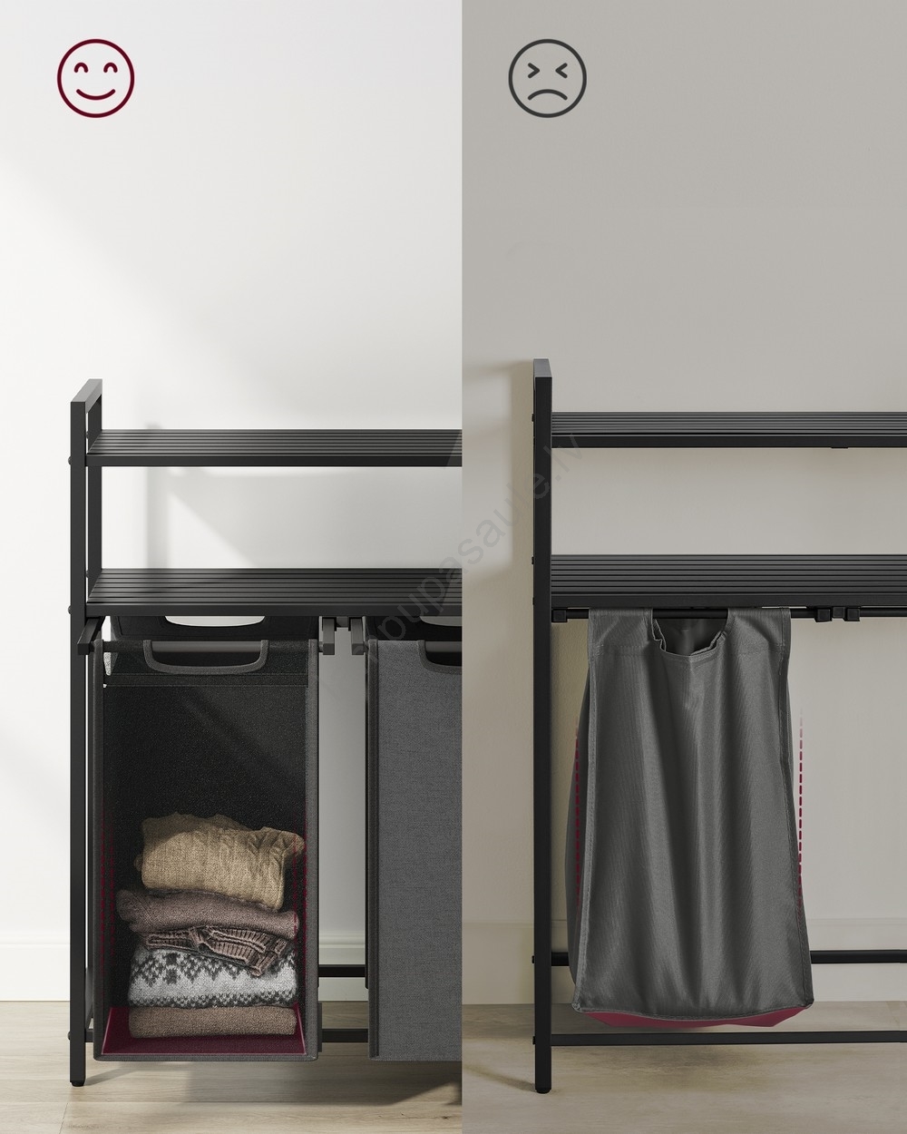 • 2 maisi, 2 plaukti – Sakārtojiet veļu divos auduma maisos (46 l katrā maisā) un novietojiet mazgāšanas līdzekļus, mīkstinātāju un citas lietas plauktos virs tiem.