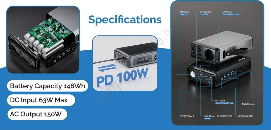 • Universāla izmantošana pateicoties vairākiem izvadiem (USB-C, USB-A, DC jack 5521, AC230V).