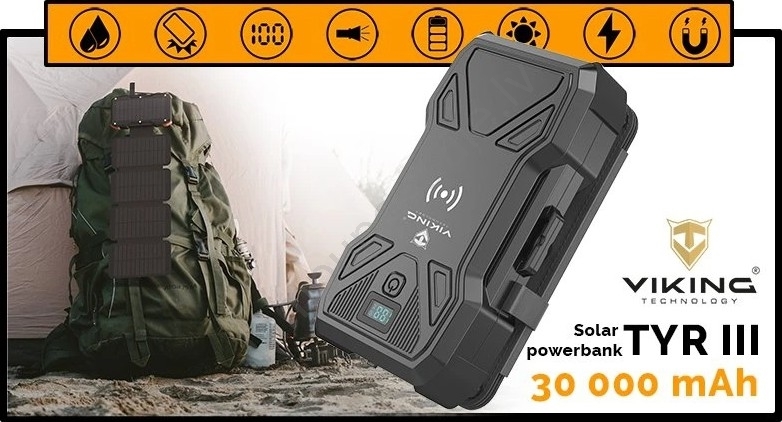 Viking - powerbank ar LED lukturi, bezvadu uzlādi un saules paneli Power Delivery 22,5W/30000 mAh