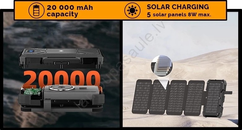 • Powerbanka ar ietilpību 10000 mAh, saules un bezvadu uzlādes funkcijām un iebūvētu LED lukturi.