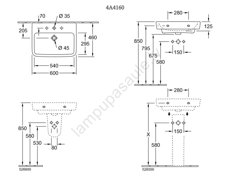 Villeroy & Boch 4A416001 - Sienas piestiprināma izlietne O.NOVO 60x46 cm, keramika/balta | Lampupasa