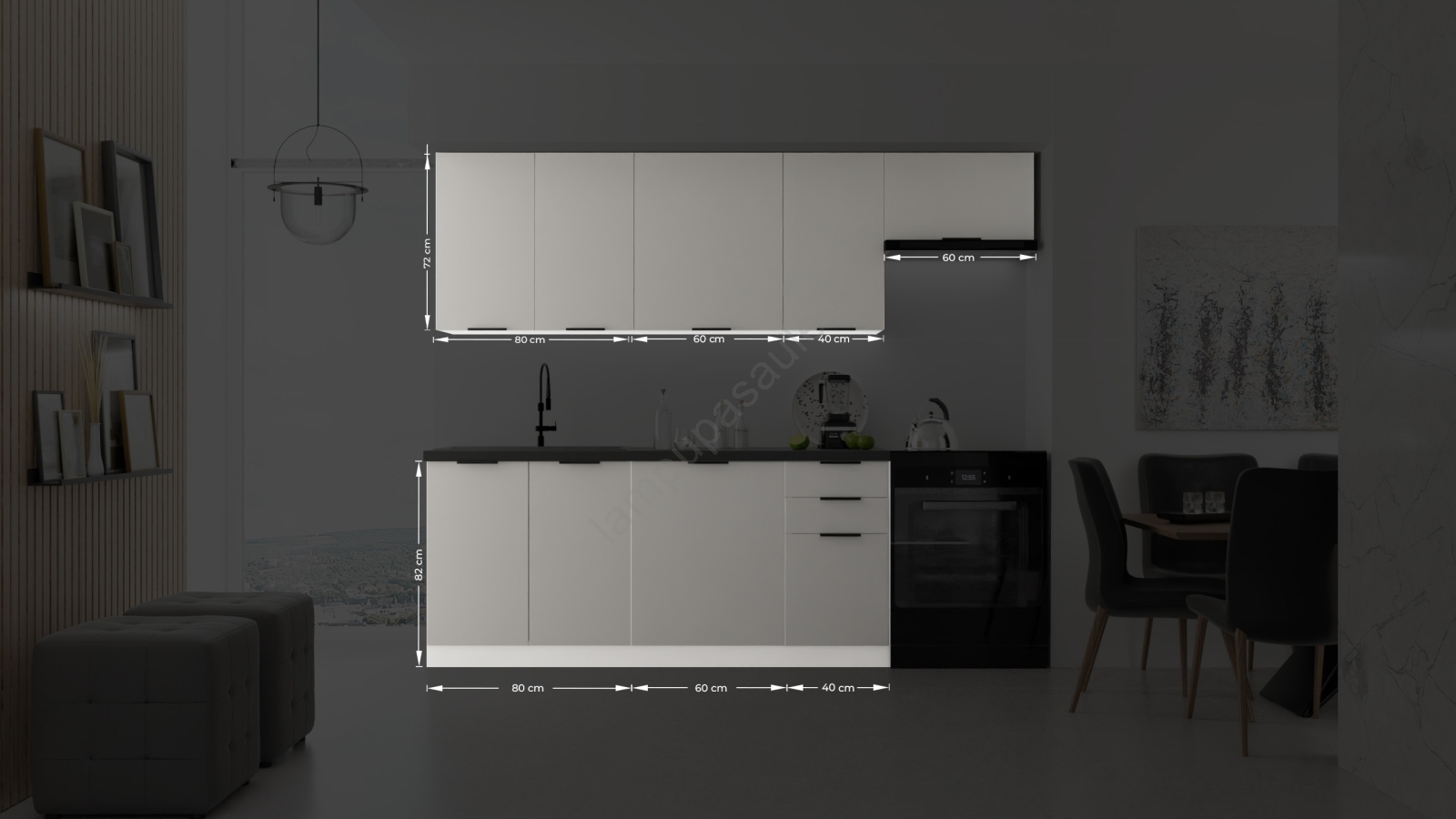 • Komplektā nav iekļotas elektroierīces, virtuves izlietne, virtuves jaucējkrāns un augšējā darba virsma.