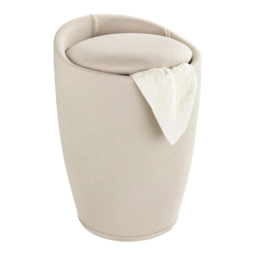 • Stilīgs vannas istabas taburete ar modernu tekstila apdari bēšā lina izskatā.