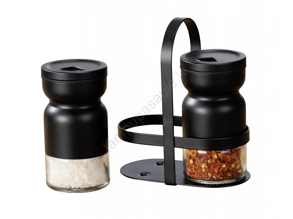 • Elegants trīsdaļīgs garšvielu komplekts ar divām garšvielu pudelītēm un praktisku turētāju.
