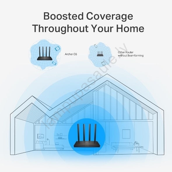 • Paplašināts pārklājums – četras ārējās antenas ar Beamforming tehnoloģiju paplašina un fokusē Wi‑Fi signālus.