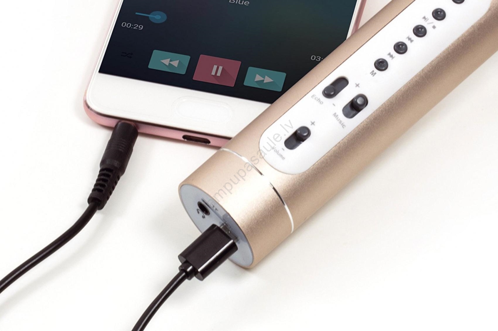 • Komplektā: karaoke mikrofons, USB–Micro USB uzlādes kabelis, audiokabelis, lietošanas instrukcija.