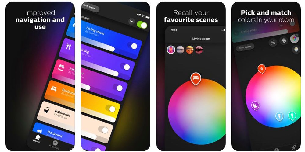 Lietojumprogrammā ir 11 iepriekš iestatītas gaismas ainas, kas imitē dabas ainavas (saulriets, ziemeļblāzma utt.) vai ainas optimālai atmosfērai (lasīšana, atpūta, gaiša nakts gaisma), un tikai no jums ir atkarīgs, kuru izvēlaties. Vakarā skatoties aizraujošu filmu iestatiet apgaismojumu blāvi sarkanā krāsā labākai atmosfērai vai gluži pretēji, jūs varat pārvērst savu dzīvojamo istabu par deju grīdu, izmantojot stroboskopa gaismas tēma. Vairāk gaismas ainu var lejupielādēt no oficiālās mājaslapas labs.meethue.com.